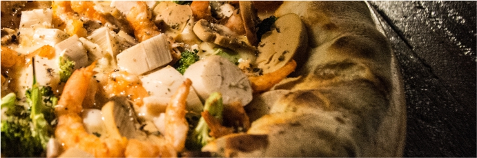 Molho de tomate, mussarela, brócolis, palmito, champignon, camarão e orégano.